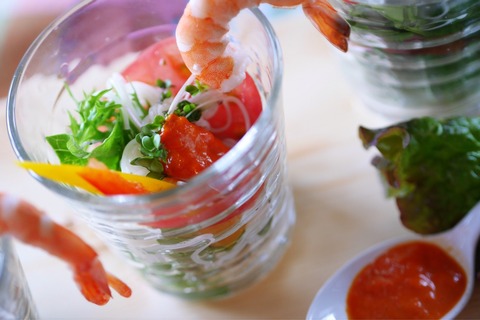 そうめんを一番下にして好きなお野菜を重ねていきます。好きなドレッシングやそうめんつゆで味付け。トマトのスライス、そうめん、好きな葉野菜、いちばん上にはブロッコリースプラウト。そしてパプリカソースをかけます。もちろん生のパプリカも盛り付けて甘みを味わいます。
