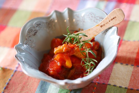 を使ってジューシーラタトゥイユ。もちろんパプリカも新玉ねぎも全て熊本県産野菜です。まつの幸せ野菜ボックスでこんなに元気のでるお料理が出来上がりました。
