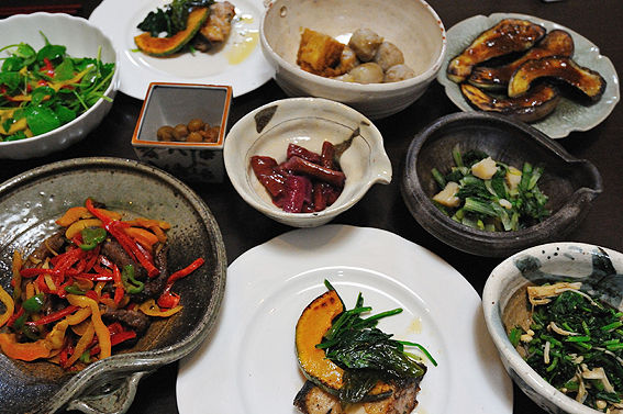 お肉や魚以外はすべて自家栽培のもの。どのお料理も、ほっこりとあたたかく、野菜の味が鮮明に感じられました。写真中央の赤紫色は、ずいきの煮物。ずいきは自分で料理したことがなく、でも食べるのは大好きです(笑) お酢と砂糖だけで漬けたという小梅も、素朴だけれど、とても印象に残りました。