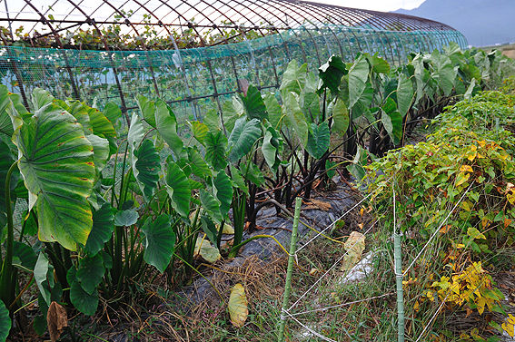出発前に、畑を案内していただきました。大きな葉っぱは、昨日の夕食に登場したずいきです。芋茎、と書き、さといもの茎(葉柄)を食べているんですよ。同じく夕食のメニューにあったさといもは、この下に埋まっています。さといものぬめりは、たんぱく質と炭水化物が結合した、ガラクタンという成分で、ビタミンB群や、たんぱく質が豊富に含まれています。さといものカリウム含有量は、イモ類の中でも、群を抜いて多いのが特長。カリウムには、血中のナトリウムを排出して、血圧を下げる効果が期待できます。血圧が気になるかたには、積極的に取り入れていただきたい食材のひとつです。