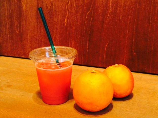 コールドプレスジュースとはこれまでのジューサーは遠心分離製法の高速回転が主流でした。高速回転ではジュースを作る過程で材料に熱が加わり、空気に触れて酸化が進むため栄養素が壊れやすい傾向がありました。それに対して、コールドプレスは粉砕・圧縮製法。一分間に約75~160回転という低速回転で、強い圧力でゆっくりと搾汁しますので、熱の発生が少なく、栄養素の破壊を最小限に抑えて搾汁することができます。今の時期のメニューは、完熟とちおとめとブラッドオレンジの2種類。スッキリしているのに味が濃く、とてもおいしいですさらに期間限定で、海外セレブの間でも話題のデトックスウォーターをはじめました。