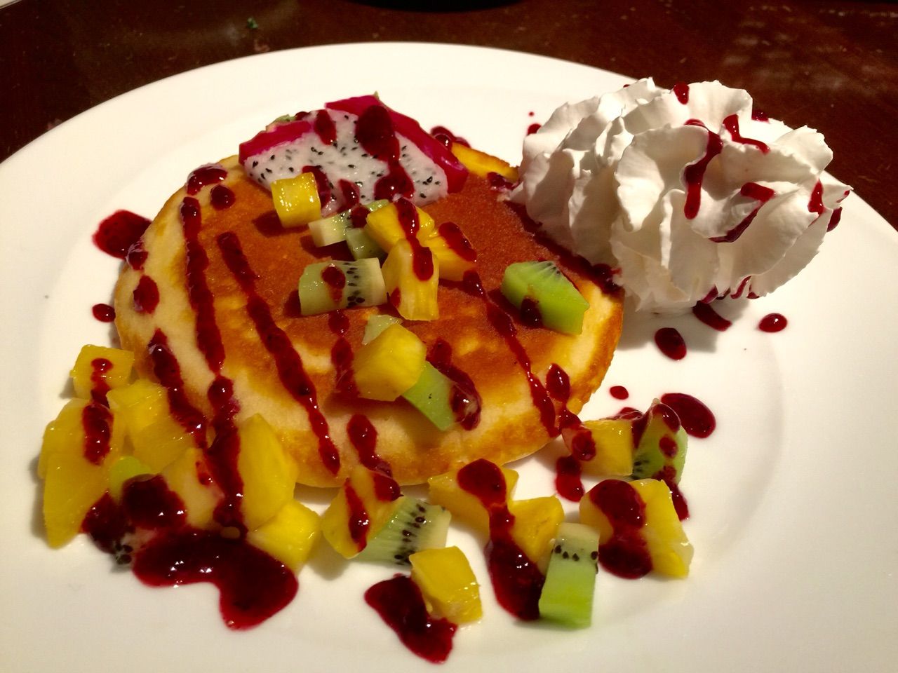 シンガポール風のさっぱりした チキンライスに生姜醤油がきいてます !お好みでパクチーや辛~いレッドカレー をかければ2度美味しいお腹はいっぱいだけど、 デザートは別腹 「自家製フルーツパンケーキ」
