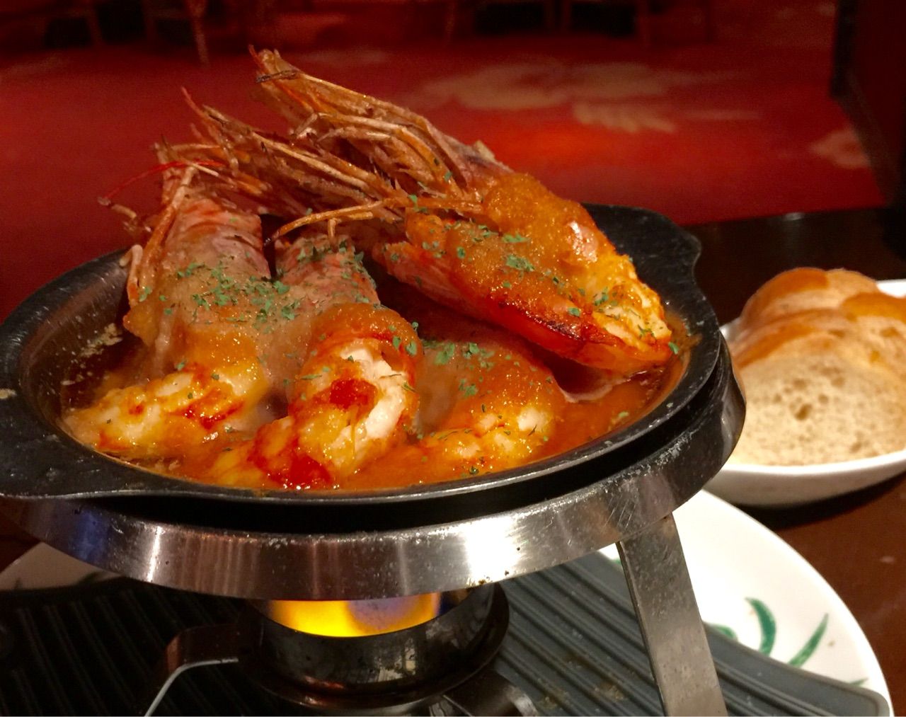 頭付きの大きなエビはボリューム満点 熱々のオニオンガーリックソースが絶品です。