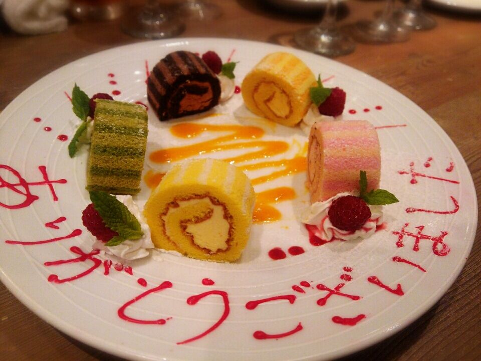フォアグラがゴロゴロのった、豪華なリゾットアーモンドミルクで仕上げた、体にも嬉しいリゾットです。デザートは「ありがとうございました」のコメント入りの『ロールケーキ』を用意して下さいました