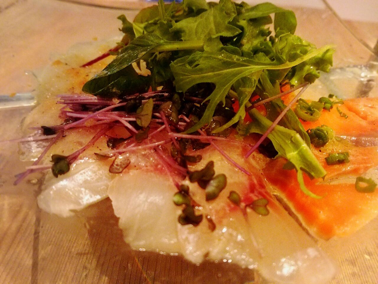 カルパチョは日替わりでその日のお薦めの鮮魚が提供されますベビーリーフやスプラウトなど、まつのの新鮮なお野菜も添えられていますよ。
