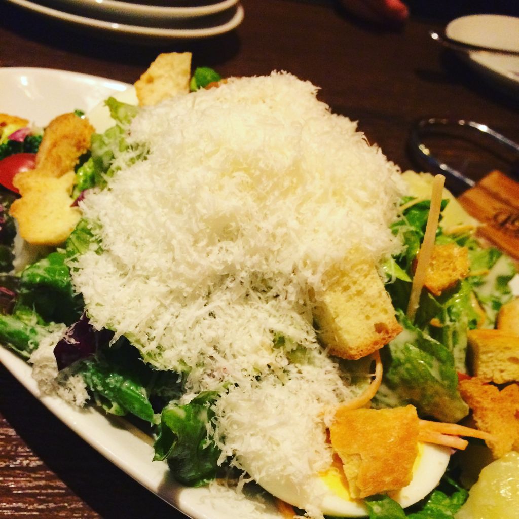 たっぷり乗ったチーズに驚き、サイズで驚き、最初にしっかりとお野菜を頂きました。