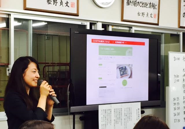 松野社長のお話を聞き、考えさせられることが多くありました。今後TPPの影響で農産物にも様々な動きがあると思います。ですが日本の野菜や果物のおいしさ・安全性は確かなものです。私たち野菜ソムリエ、ベジフルサポーターは株式会社まつのと共に日本の農業を知り、応援し、その魅力を伝えていきたいそう思いました。続きましてシニア野菜ソムリエ・管理栄養士大人のダイエット研究所代表の岸村康代さんの講演です。                                                                                                   ~忙しい大人が無理なく食事を楽しみながら健康になる~それをコンセプトにした『大人ダイエット研究所』を設立されそこで提案されていることの一部のお話をしていただきました。岸村さん写真