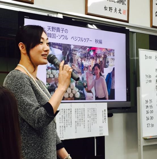 続きましてアナウンサー、ベジフルコミュニケーター、ジュニア野菜ソムリエの天野貴子さんテーマは「最新の韓国事情」・韓国の食生活薬食同源、五味五色・韓国のスーパー・韓国の野菜普段知ることの出来ない貴重なお話をしていただきました。