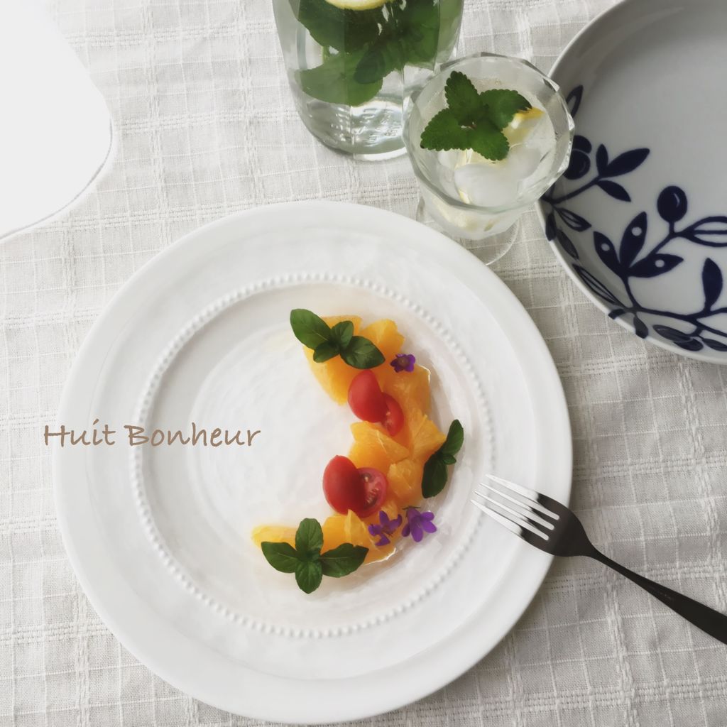 使ったハーブはアップルミント。オレンジとミニトマトをオリーブオイルでマリネしてハーブを盛り付けて出来上がりです。