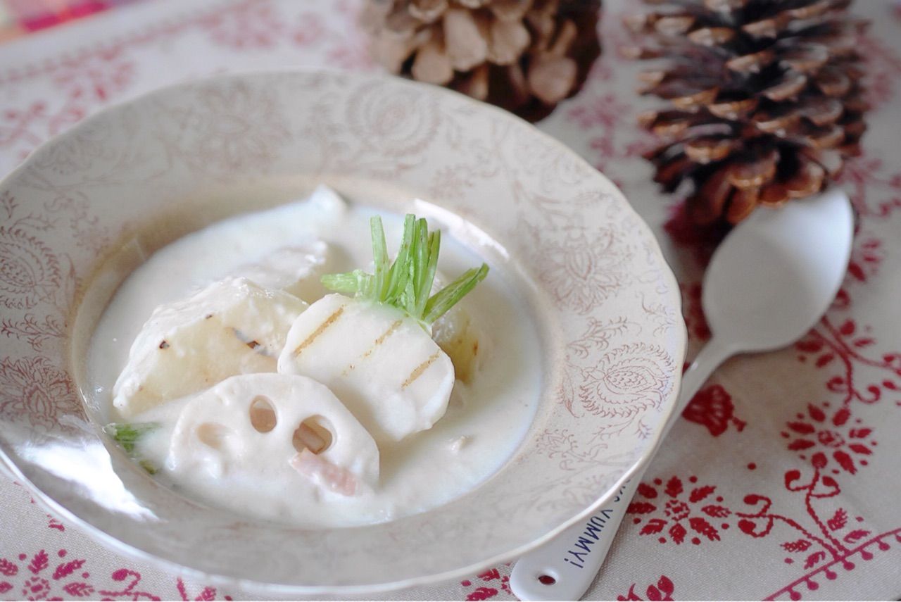 カブをオリーブオイルでソテーしてベーコン玉ねぎと一緒にコトコト煮込んだクリーム煮