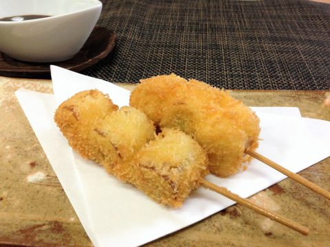 岩津ねぎを串に刺しパン粉をつけて串カツ風に。揚げることでさらに岩津ねぎの甘味が感じられます。