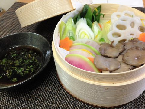 旬野菜とともにせいろで蒸して、葉の部分を刻んで入れたぽん酢を添えて。