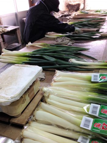 岩津ねぎは洗わず、1本1本エアーで外葉を取り除き、丁寧に拭いてから、長い葉を傷めないようにサイズごとに袋詰めしていきます。全て手作業なので本当に大変です。丁寧に袋詰めされ、段ボールに梱包して出荷されます。