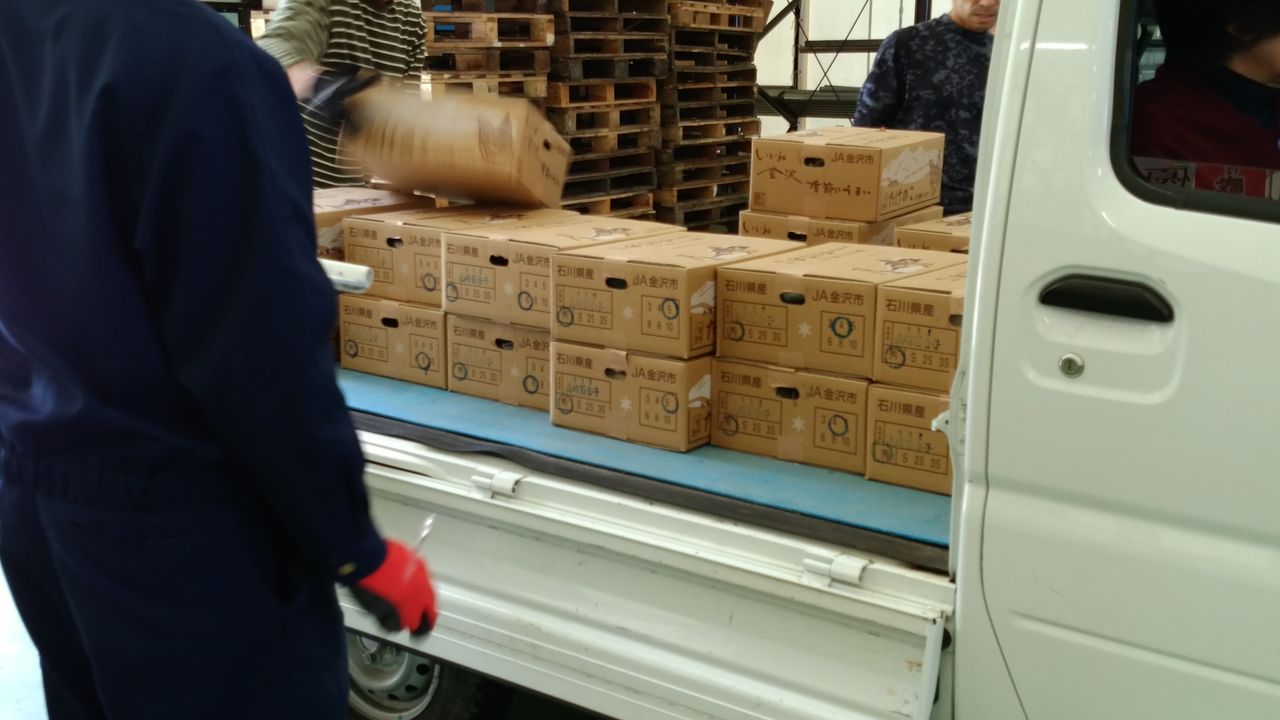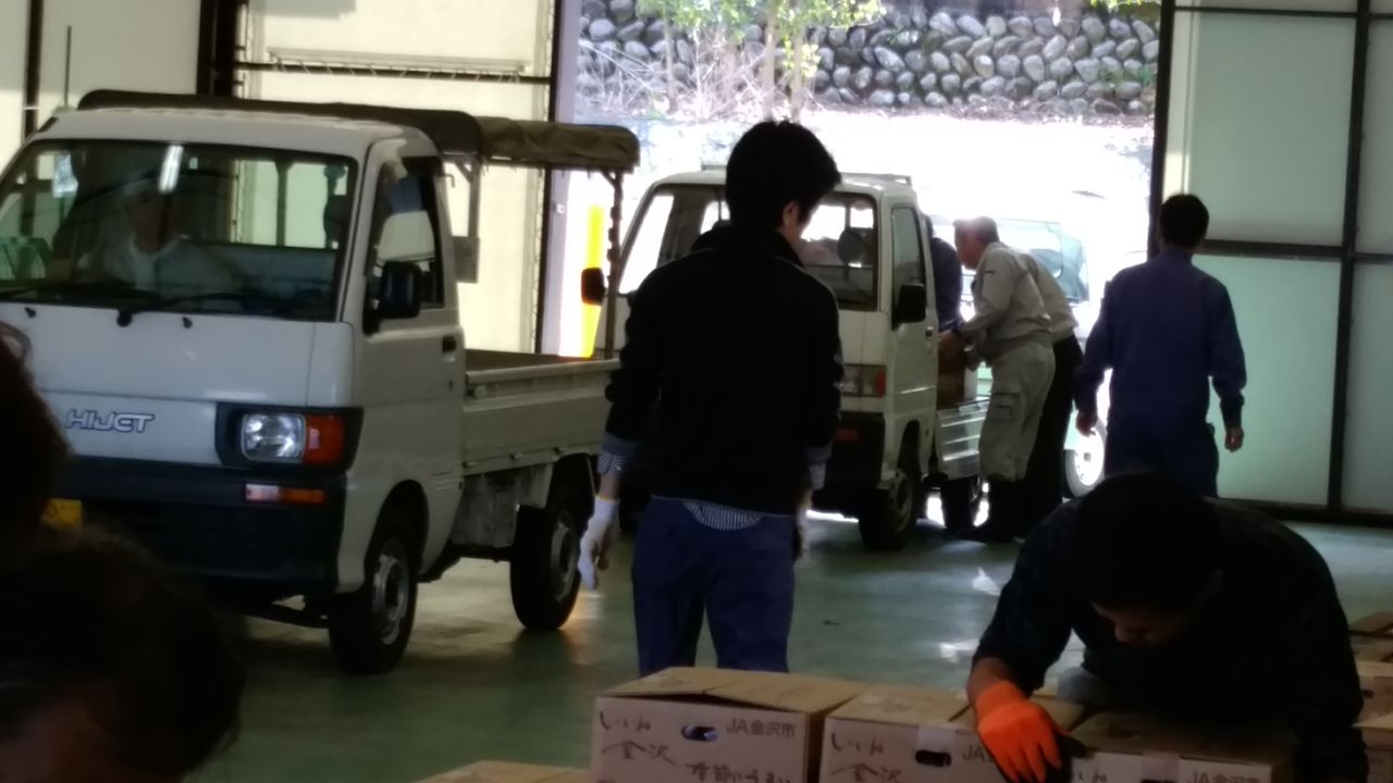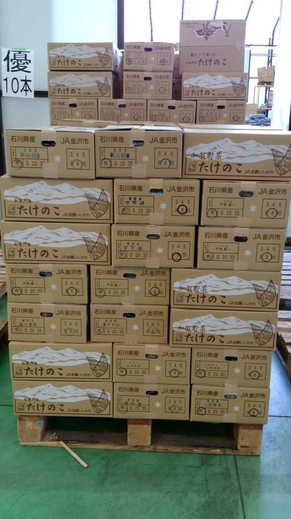 この日は県産たけのこの9割を生産する JA金沢市の初出荷で集出荷場には生産者が朝掘ったたけのこをトラックに 乗せて次々と運びこんでいます。