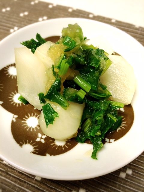 カブの葉と茎は細かく刻み、先端部は5mm程の厚さに切ります。こちらをサッと茹で、自然に水気をきり、ダイコンおろしに、しょう油を加えて和えたものです。カブの甘味とダイコンおろしの辛味がいいバランスです。