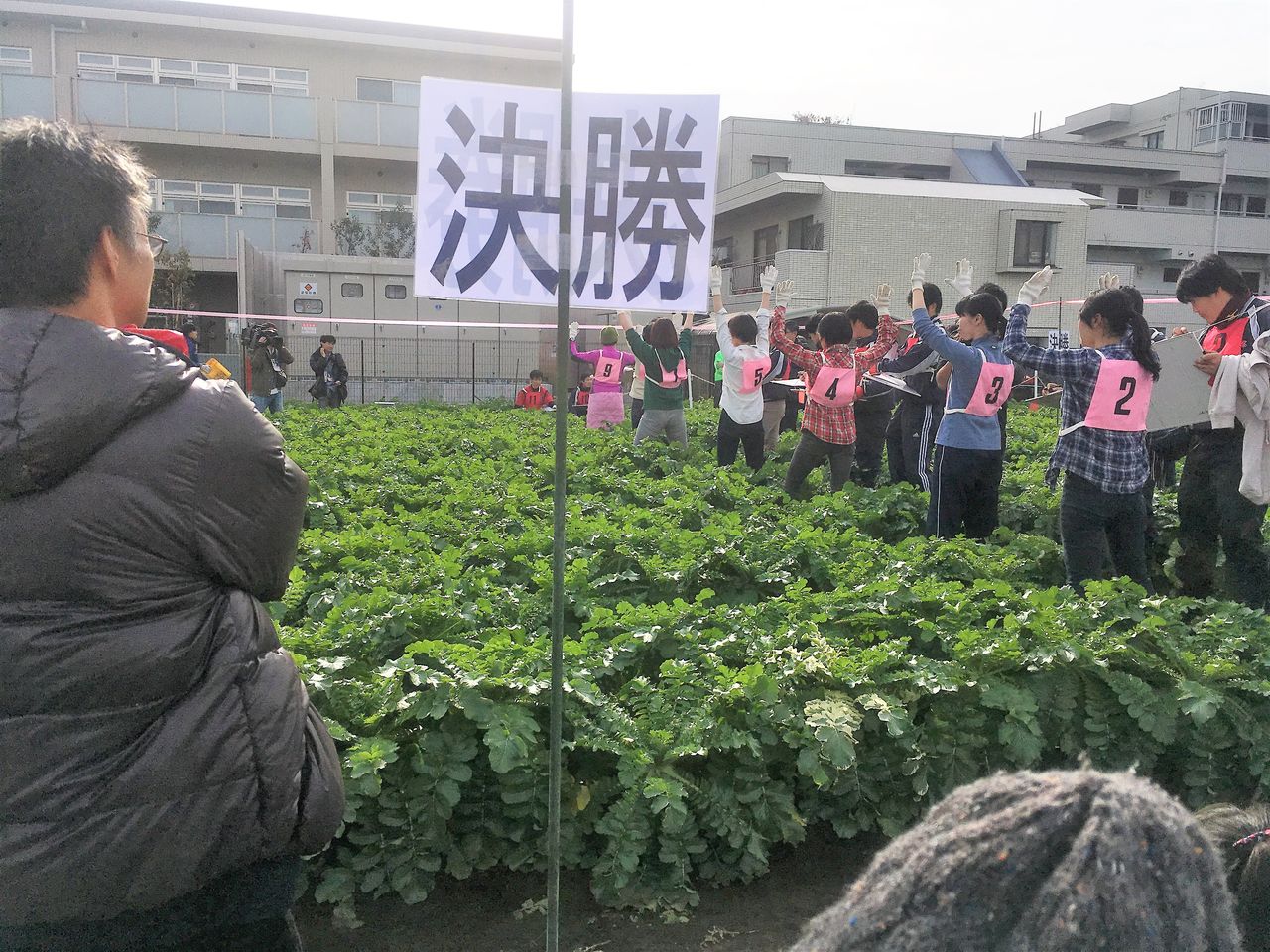 スカッと練馬大根を抜くと一列目に置きます。抜くたびにどんどん遠くなって行くので、抜くのも大変ですが置きに戻るために大根を持って走る!始めは反復横跳びのように…そして最後は猛ダッシュ!みなさん、終わったあとは息を切らし肩を上下させているのが見えました。ハードな戦いです!